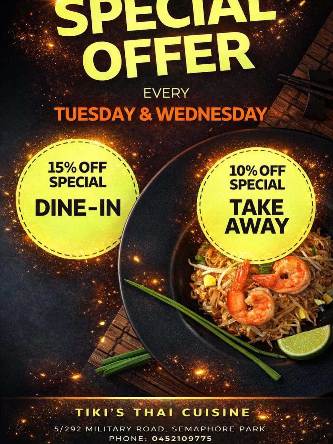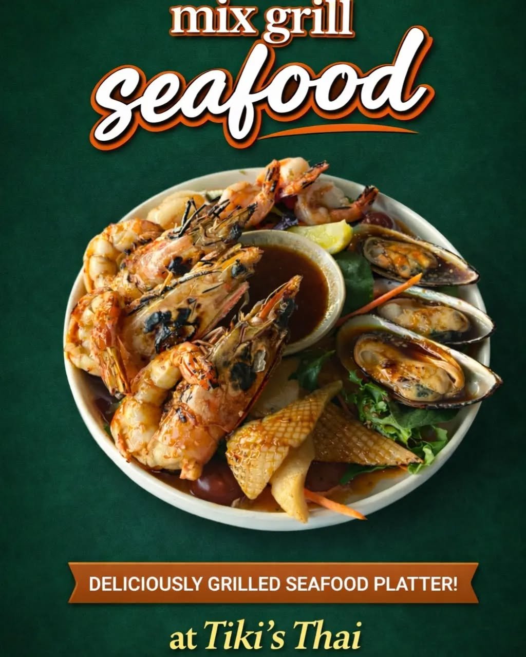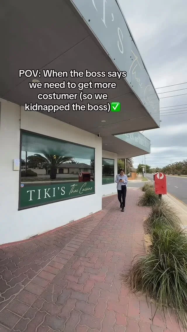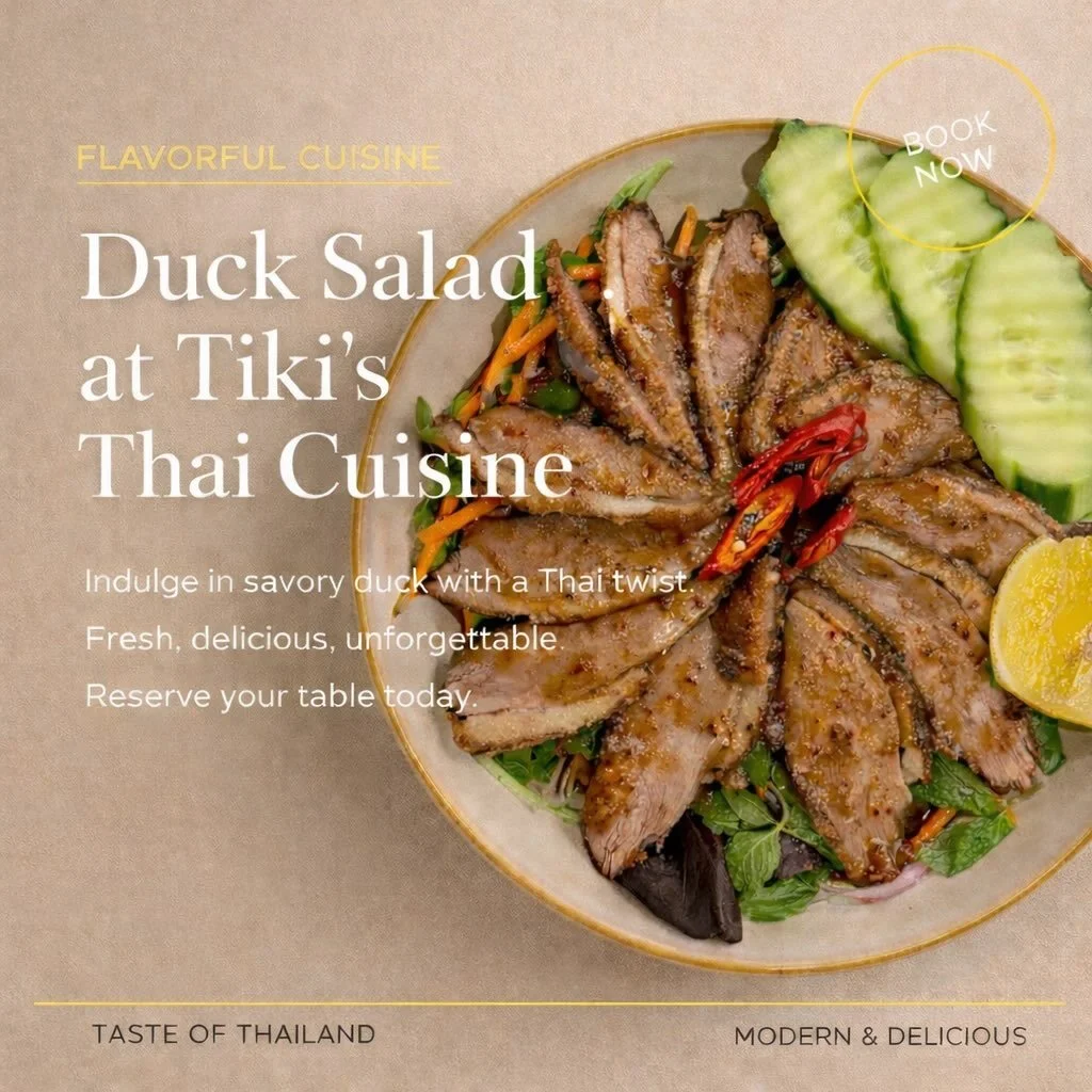 Interior of Tiki's Thai Cuisine restaurant with tables, chairs, hanging green plants, and warm lighting.